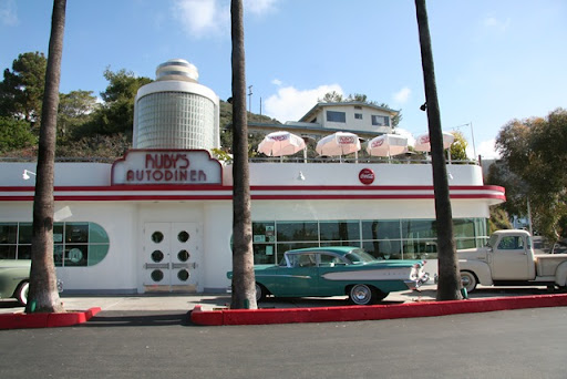 Monday was our free day before my conference started so we were up and ready to head out pretty early. Just before we headed down to the car it started raining pretty hard so we grabbed some umbrellas and shrugged our shoulders. By the time we had gone a couple of miles up the coast the rain and stopped and the sun had come out. We had breakfast at the Ruby's Diner in Laguna Beach - it had some cool old cars parked out front.